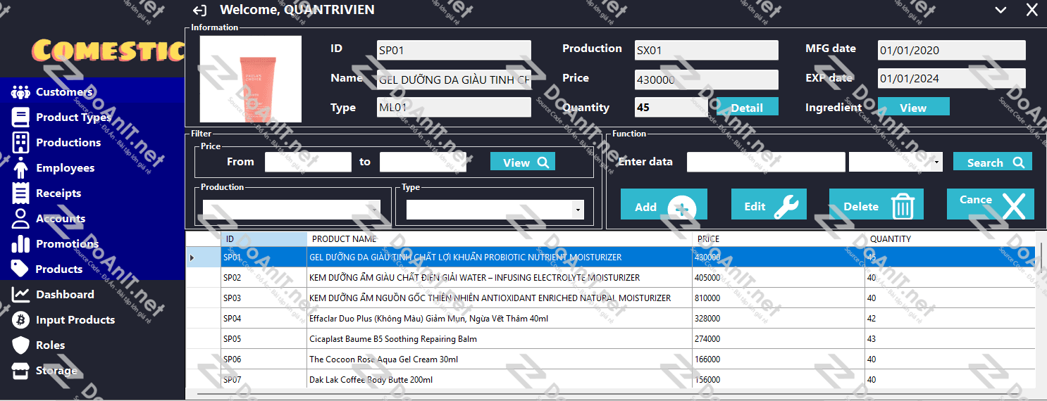 Theo dõi mỹ phẩm theo mã, tên, loại, thương hiệu, hạn sử dụng và giá bán