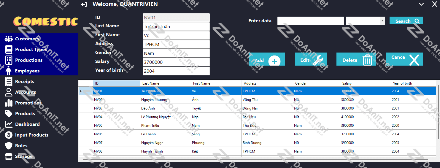 Hỗ trợ thêm, sửa, xoá, tìm kiếm nhân viên trong hệ thống
