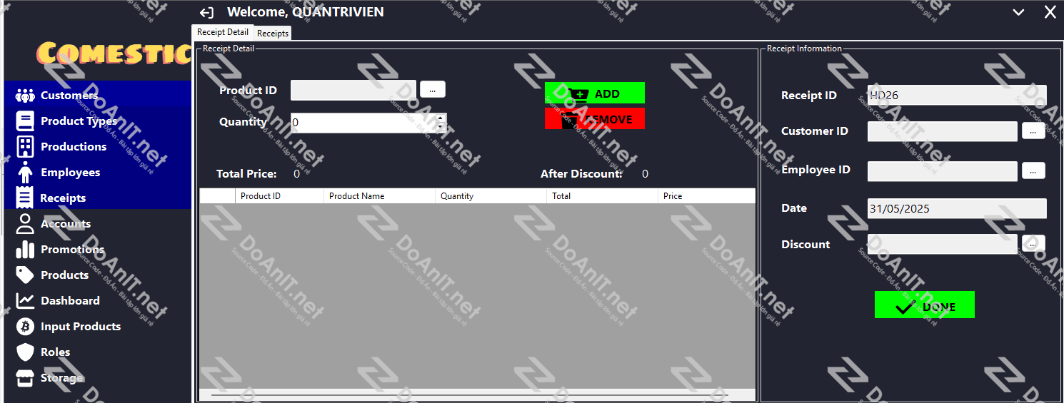 Phần mềm quản lý cửa hàng mỹ phẩm được xây dựng bằng ngôn ngữ C# WinForm, phù hợp cho sinh viên thực hiện đồ án tốt nghiệp hoặc các cửa hàng kinh doanh mỹ phẩm muốn quản lý quy trình bán hàng và dữ liệu một cách chuyên nghiệp, đơn giản và hiệu quả.