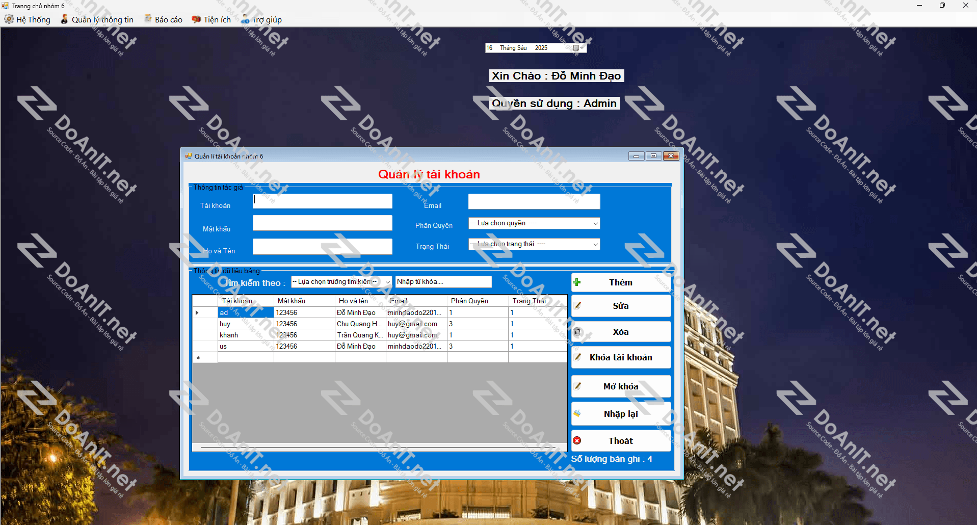 ✅ Quản lý tài khoản: Thêm, sửa, xoá tài khoản người dùng; phân loại theo vai trò.