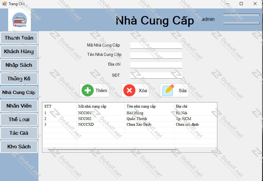 Quản lý nhà cung cấp: Lưu thông tin nhà cung cấp sách như tên, địa chỉ, SĐT, hỗ trợ nhập hàng dễ dàng.