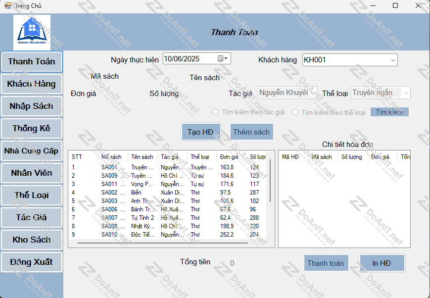 Chức năng thanh toán tự động tính tổng tiền, in hóa đơn nhanh chóng sau khi bán sách.